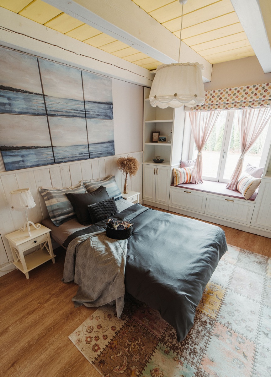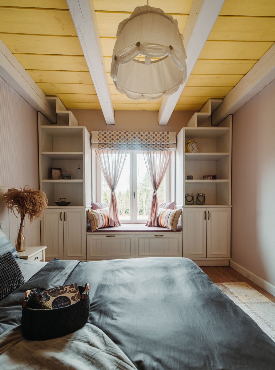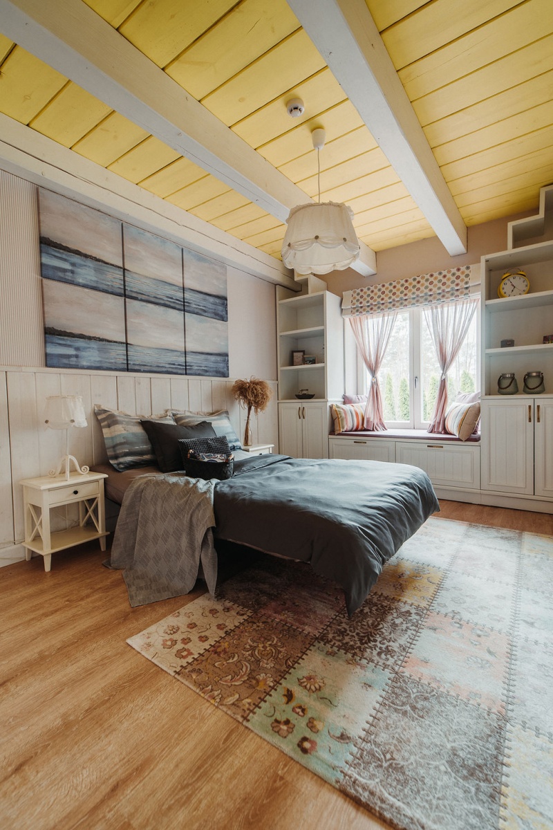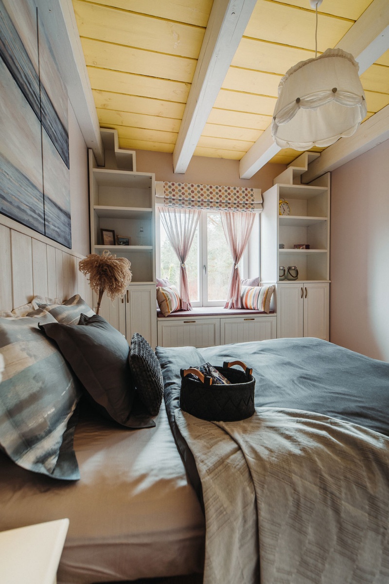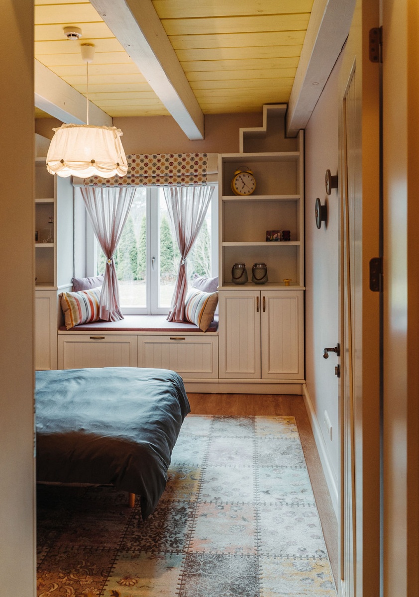 Viena no guļamistabām ar skatu uz dārzu, kur komfortabli un harmoniski jutīsies gan bērni, gan pieaugušie. Gultas izmērs 140*200cm
