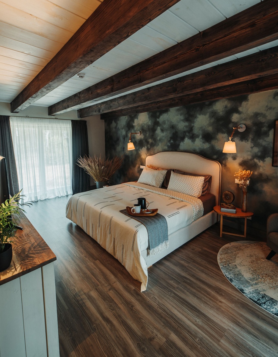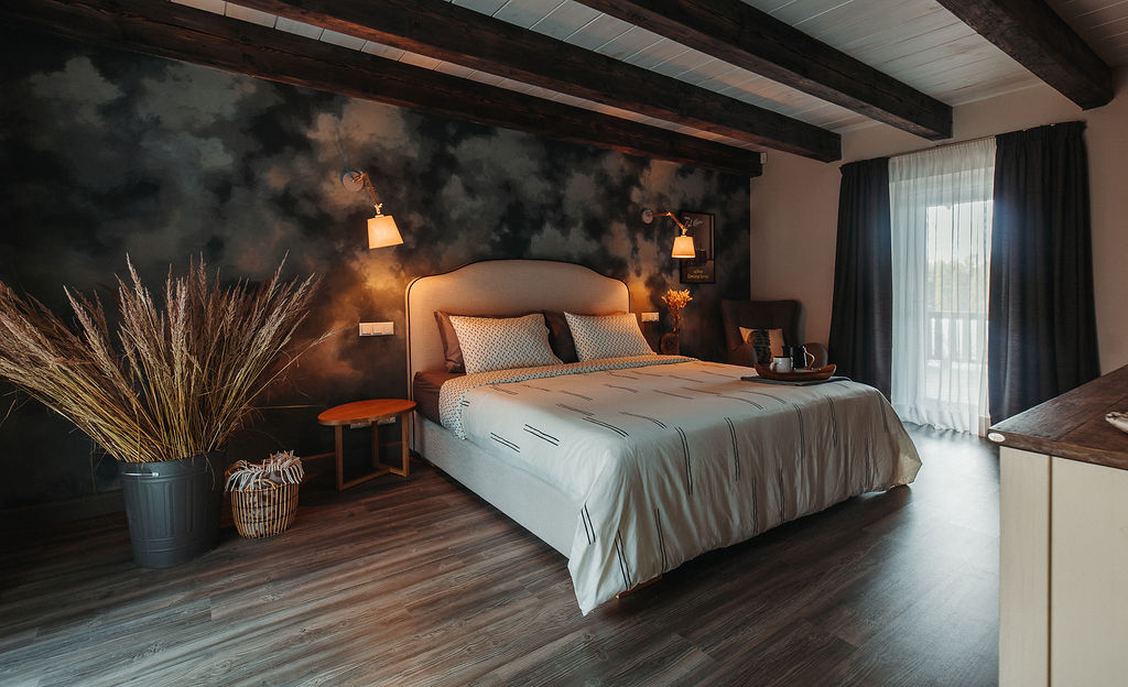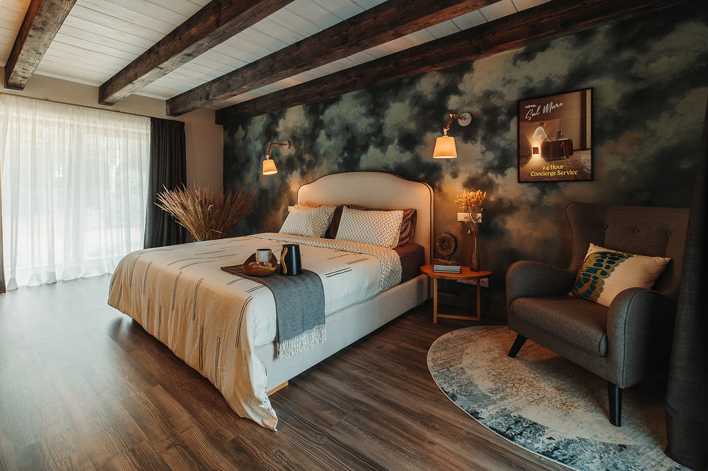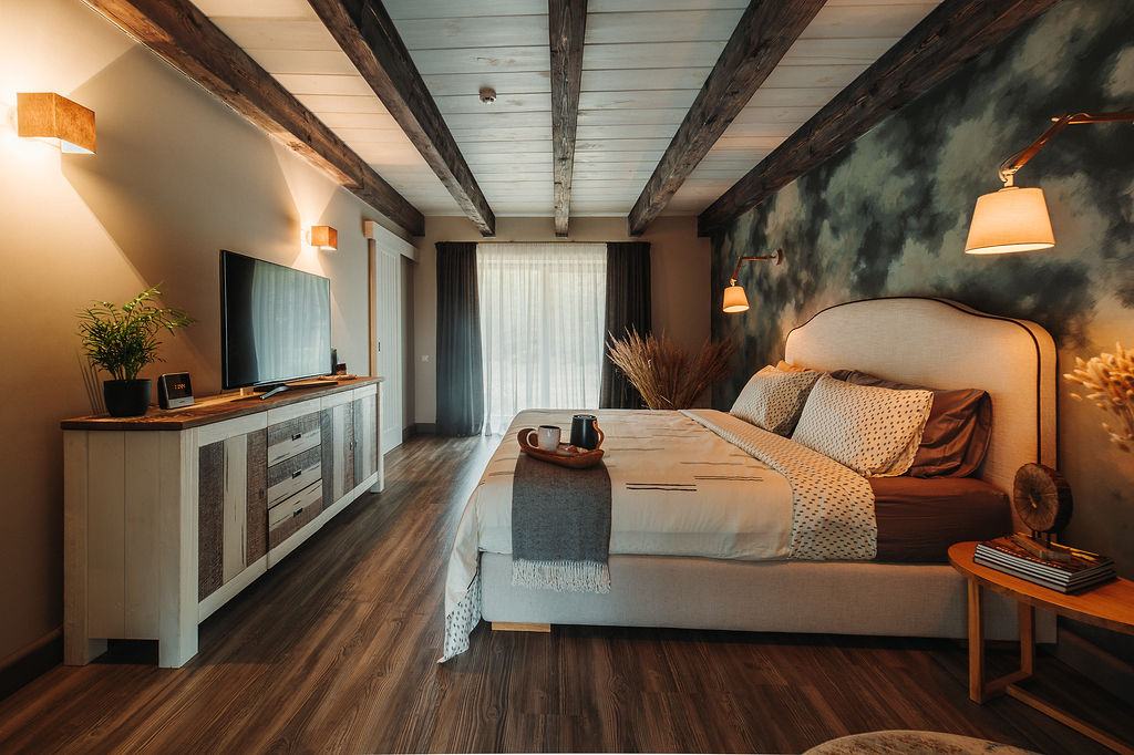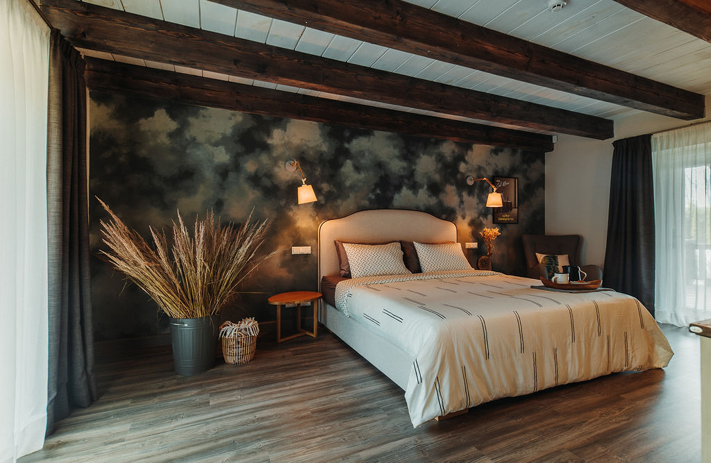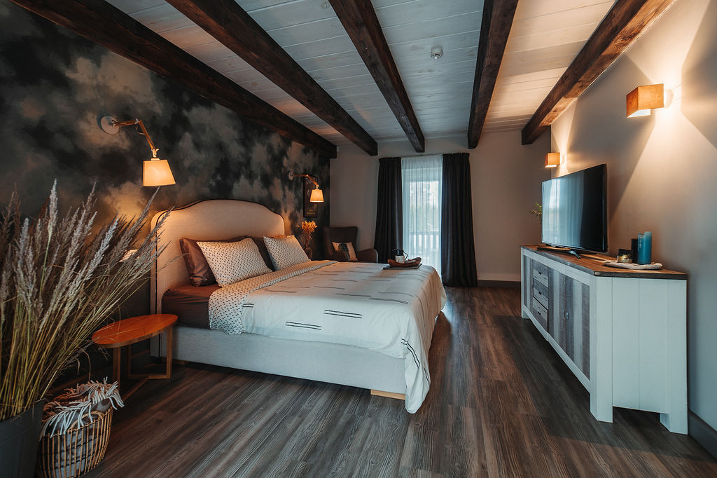 Plaša un mājīga master guļamistaba jebšu "vecāku gals" Mežnorās ar privāto vannasistabu, skapja telpu, skatu gan uz kāpu zonu caur stikla bīdāmajām durvīm, gan uz dārzu ar izeju uz privātu terasi un piekļuvi apsildāmajam baseinam. Naktsmieru baudi plašajā 2m*2m "Nakts Mēbeles" gultā.